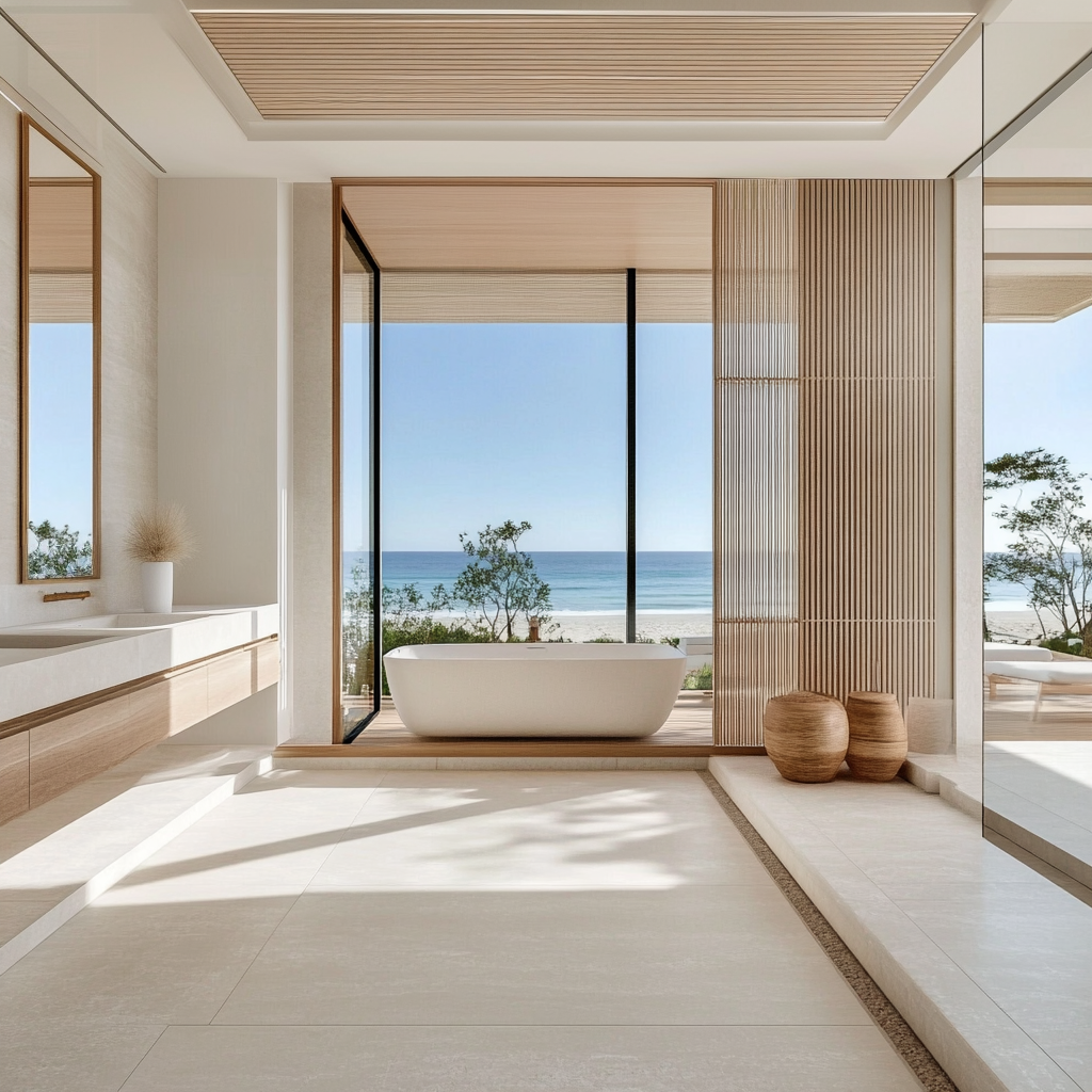 Framing the Ocean Views Expansive glazing ensures that nature plays a starring role, drawing the shifting light and endless horizon into the heart of the home. Thoughtfully layered window treatments offer softness and flexibility, filtering natural light to enhance the mood at different times of the day.