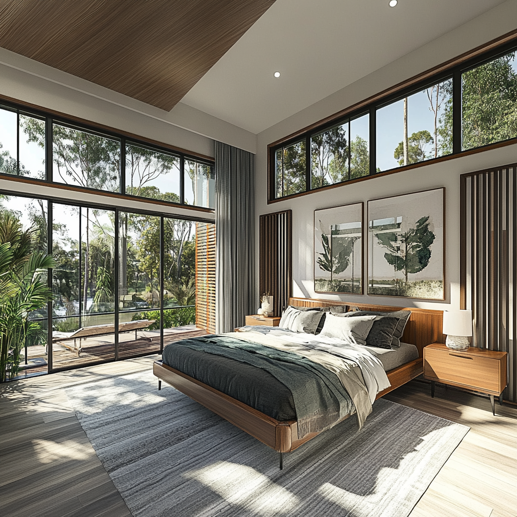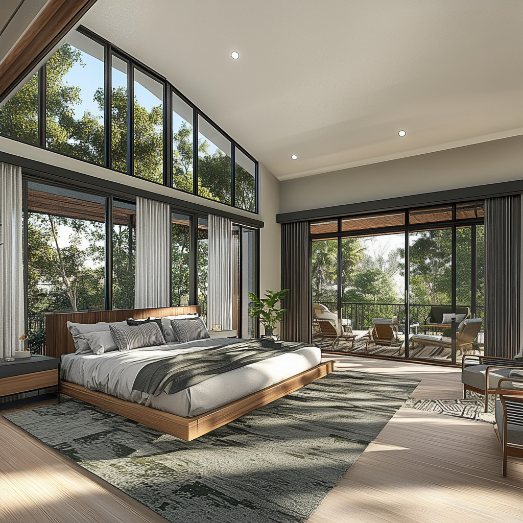 Expansive openings frame curated views of the outdoors, allowing natural light to animate the interiors throughout the day. The strategic placement of glazing fosters a seamless dialogue between interior and exterior spaces, enhancing the residence’s sense of openness.